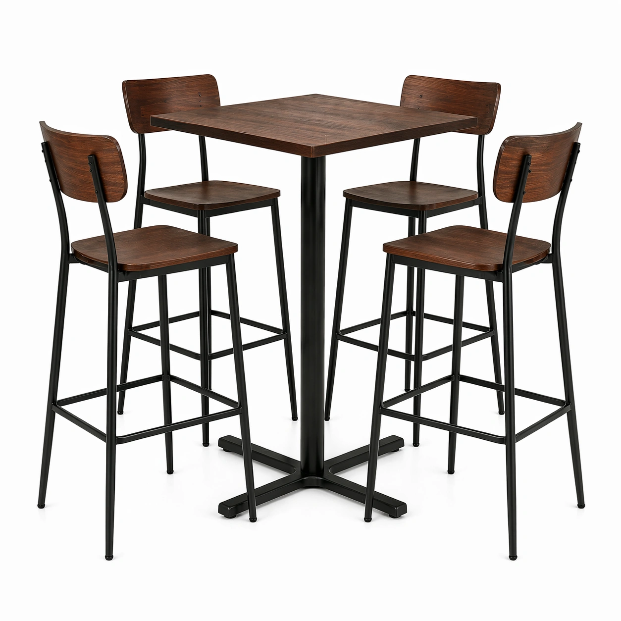Material: Tischplatte und Sitzflächen aus MDF mit Holzfurnier, Gestell aus pulverbeschichtetem Stahl.