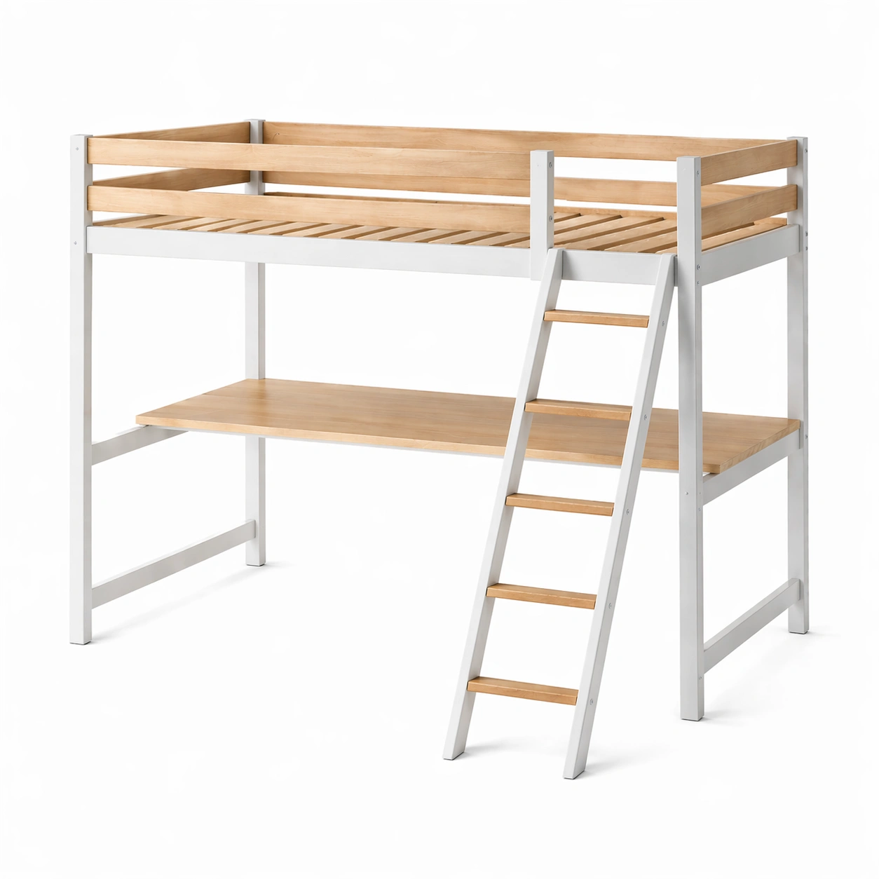 Das Hochbett besteht aus einem Rahmen aus Kiefernholz und pulverbeschichtetem Metall. Die gesamte Struktur ist mit einer weißen Oberfläche kombiniert mit naturbelassenen Holzakzenten. Die Maße betragen 200 cm x 90 cm x 160 cm. Tragfähigkeit liegt bei ca. 120 kg.